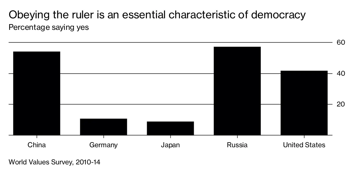 最后一张图表与上面的图表相呼应。中国在认为服从统治者是民主的基本特征方面几乎与俄罗斯并驾齐驱。习近平利用这一点,在各处张贴自己巨大的海报,形成一个 个人崇拜 仅次于毛泽东周围的个人崇拜。德国和日本对其统治者的盲目服从导致了第二次世界大战的灾难,在这一指标上极其低。再次令人惊讶的是,许多美国人认为服从是民主的一个不可或缺的部分。幸运的是,对于美国的民主来说,图表4被图表1所抵消——美国人可能倾向于服从他们的领导者,但他们对政府做正确事情的信心非常低。我受到了一篇题为“对中国威权韧性的‘惊讶’”的文章的启发,该文章由爱荷华大学的政治学家唐文芳撰写,出现在《美国事务》期刊的春季卷中。唐写道:“是的,中国人可能期望极低,但他们确实感到自由,而这种感觉很重要,因为不快乐的公民可能会导致政治动荡。”唐补充道:“中国常常被一些西方媒体和学者用意识形态有色眼镜来评判。”他写道,西方的价值判断“阻碍了研究人员理解中国政治系统中什么有效,什么无效,无论它是好是坏。”