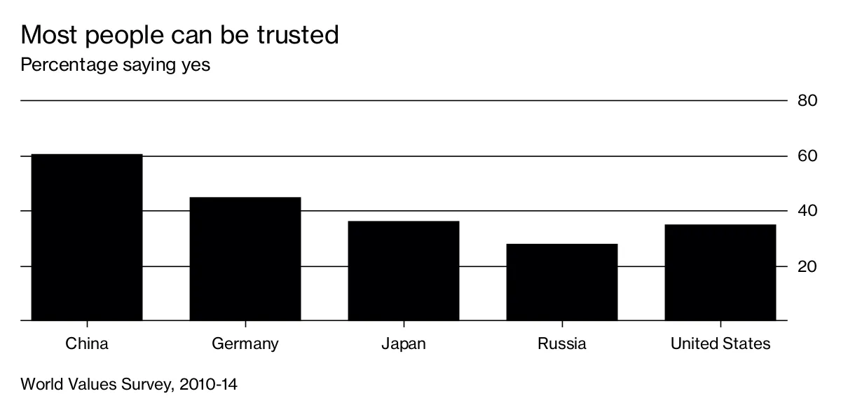 世界价值观调查,2010-14世界价值观调查,2010-14第二张图表颠覆了美国和其他民主国家的另一个普遍信念,即生活在压迫政权下会腐蚀公民社会,使人们相互对立。中国在普通公民之间的信任度上超过了德国、日本和美国,以及俄罗斯。(人们更不可能在这方面对调查员撒谎。)