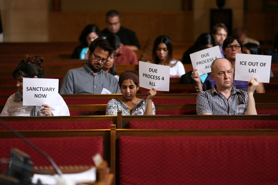 移民支持者在2017年3月洛杉矶市议会期间抗议。露西·尼科尔森/路透社杰夫·塞申斯在他针对所谓“庇护”政策的攻击中发起了他最有力的攻击——升级了检察长对加利福尼亚州的持续战争。