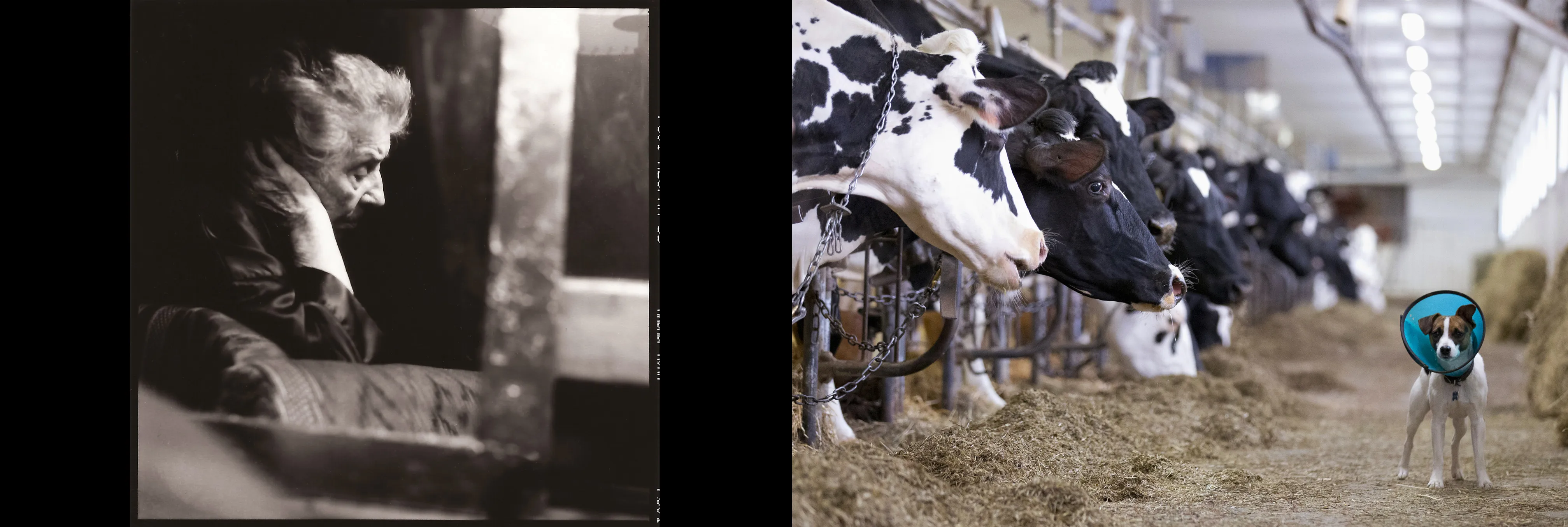 左: 克里斯廷的祖母,“欧玛”(凯瑟琳·穆希),在镜子中反射,讨论她对美和衰老的看法,地点在安大略省汉密尔顿,作为一个关于90岁以上女性美的持续摄影项目的一部分。 右: 一只狗在2017年4月于魁北克省格兰比的一家农场前面站着,旁边是奶牛(为彭博社)。