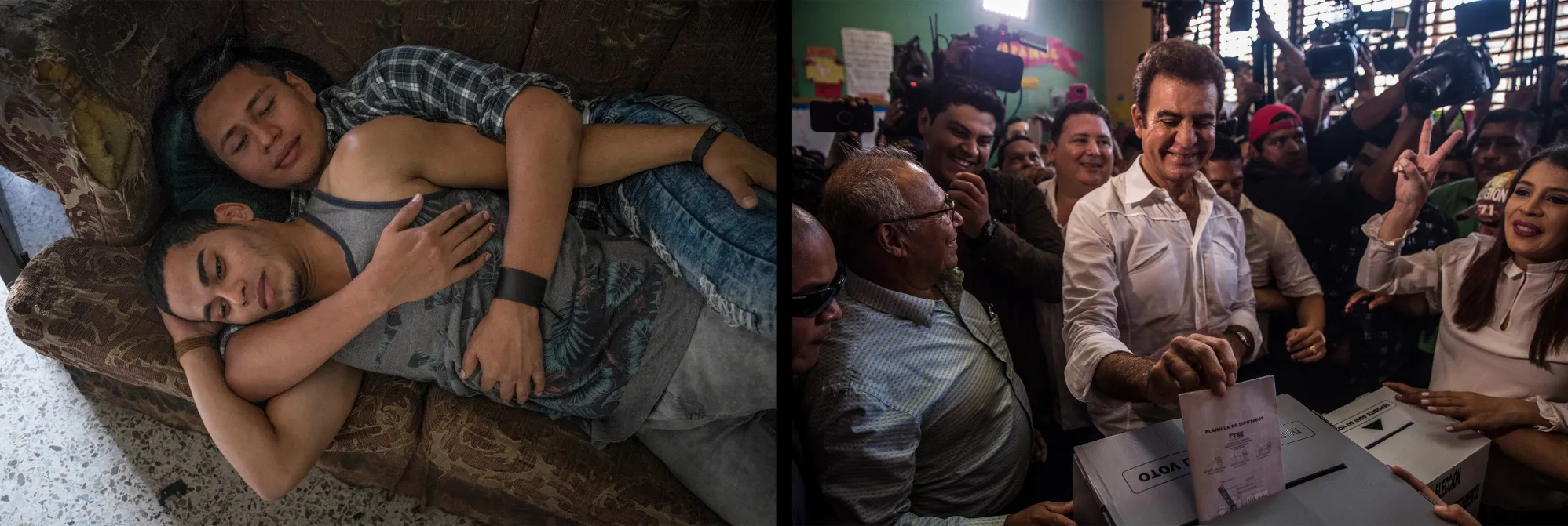 左: 一对情侣在洪都拉斯特古西加尔巴的LGBT组织Arcoiris的沙发上相拥。脆弱群体在暴力的洪都拉斯面临更大的风险。右: 洪都拉斯反对派领袖萨尔瓦多·纳斯拉拉在11月26日的总统选举中,在特古西加尔巴的投票站投票(来自彭博社)。