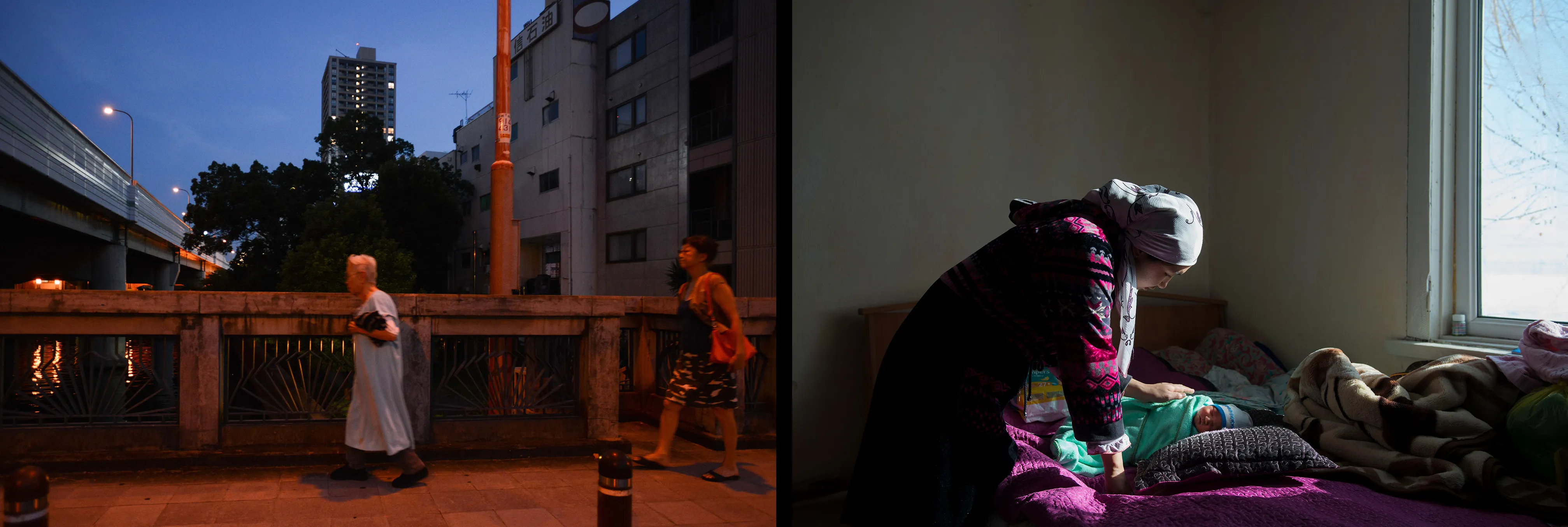 *左:*前护士和阿尔茨海默病患者坂井朝代,10多年前被诊断,2014年8月6日与女儿秋子在大阪的公寓附近散步(为彭博社)。*右:*一张照片显示吉尔吉斯的迪娜拉在从医院回家后照顾她的新生女儿。她在2012年10月被一个男人绑架,正好是在他们相识10天后。虽然在吉尔吉斯斯坦是非法的,但在农村地区仍然发生新娘绑架。尽管她被迫结婚,迪娜拉现在与家人幸福地生活。这种新娘被称为“Ala Kachuu”,意为“抓住并逃跑”。
