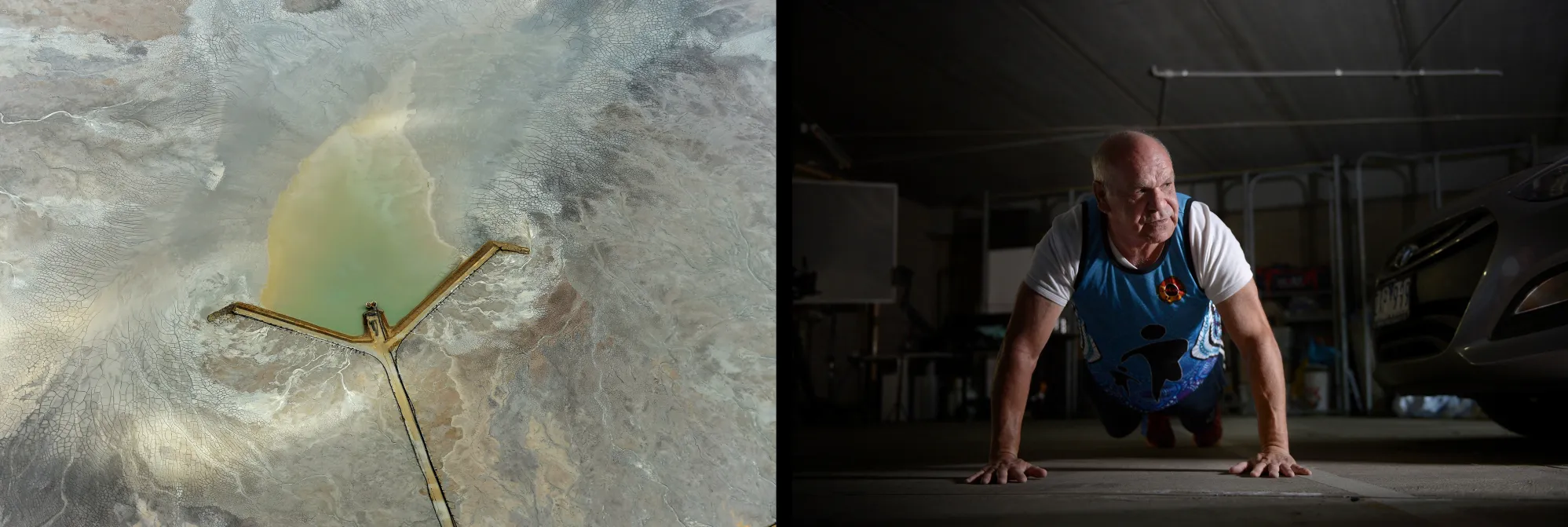 *左:*在澳大利亚卡尔古利上方拍摄的Fimiston露天矿的尾矿坝(为彭博社拍摄)。 *右:*土著长者Reg叔叔在经历两次心脏病发作后决定改变自己的生活模式。土著人口的预期寿命比非土著人短30年。在这里,他于2017年1月在墨尔本拍照,作为Oxfam“缩小差距”运动采访的一部分,强调了土著人口的健康状况。