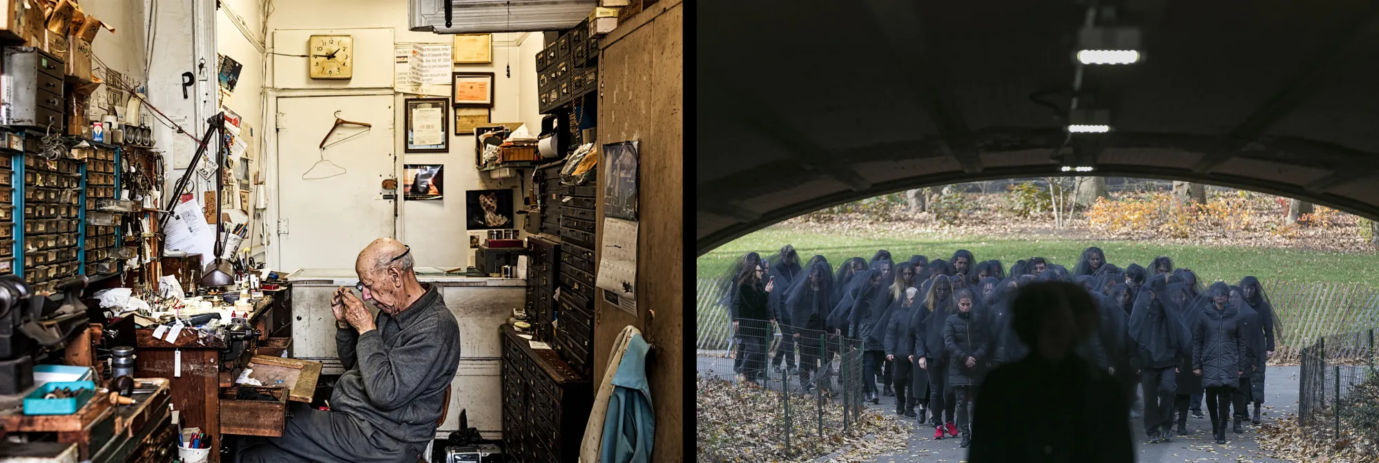 左: 阿尔·马多克斯,马多克斯手表公司的老板,在2013年于下曼哈顿的店里修理手表。该图像来自穆恩的照片散文《一个老手表人的歌》。 右: 蒙面示威者在2017年12月2日穿过纽约中央公园,参加“梦杀手”事件中的表演艺术抗议(为彭博社)。