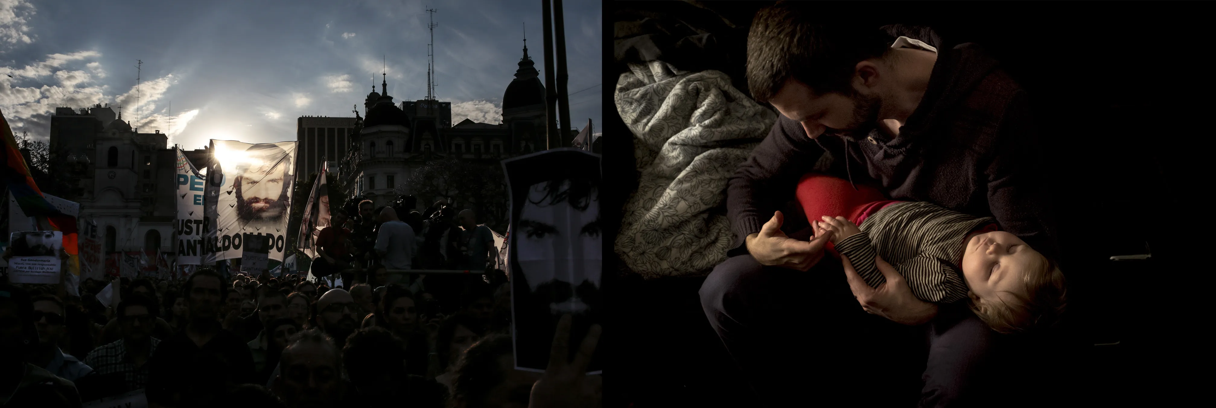 左: 在活动家圣地亚哥·马尔多纳去世后,示威者于11月1日在布宜诺斯艾利斯参加“要求正义”游行(为彭博社)。 右: 摄影师的兄弟米兰于2015年12月25日抱着他熟睡的女儿,九个月后他突然心脏骤停去世。该图像是帕布斯正在进行的个人项目“未来”的一部分,涉及家庭、记忆和第二次世界大战。