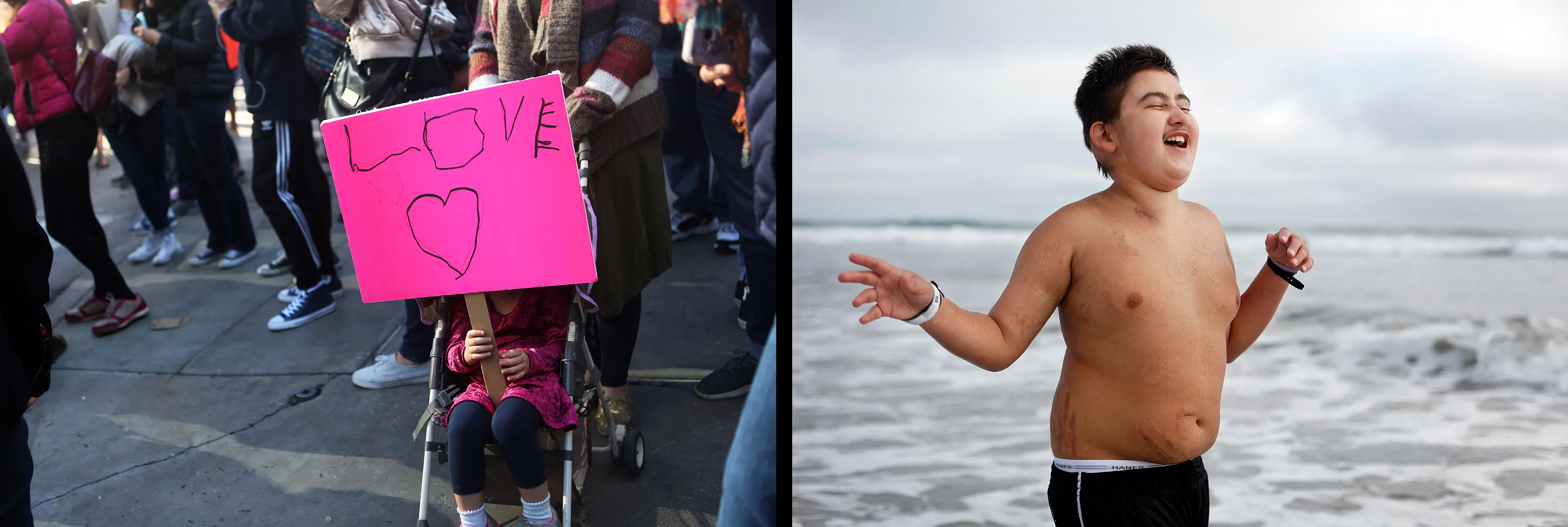 左: 一名儿童在1月20日的洛杉矶女性游行中举着标语牌(为彭博社)。 右: 伊桑·阿尔贝洛,11岁,2013年在加利福尼亚州卡尔斯巴德的海滩上奔跑,离开医院一个小时后。2012年3月被诊断为III级间变性星形胶质瘤,一种末期脑癌,伊桑被开处方延长生命的治疗。在他的母亲玛丽亚·马尔多纳的帮助下,他开始了一次横跨全国的公路旅行,去完成他想做的事情清单。加利福尼亚是中途站。他于2014年7月3日去世。