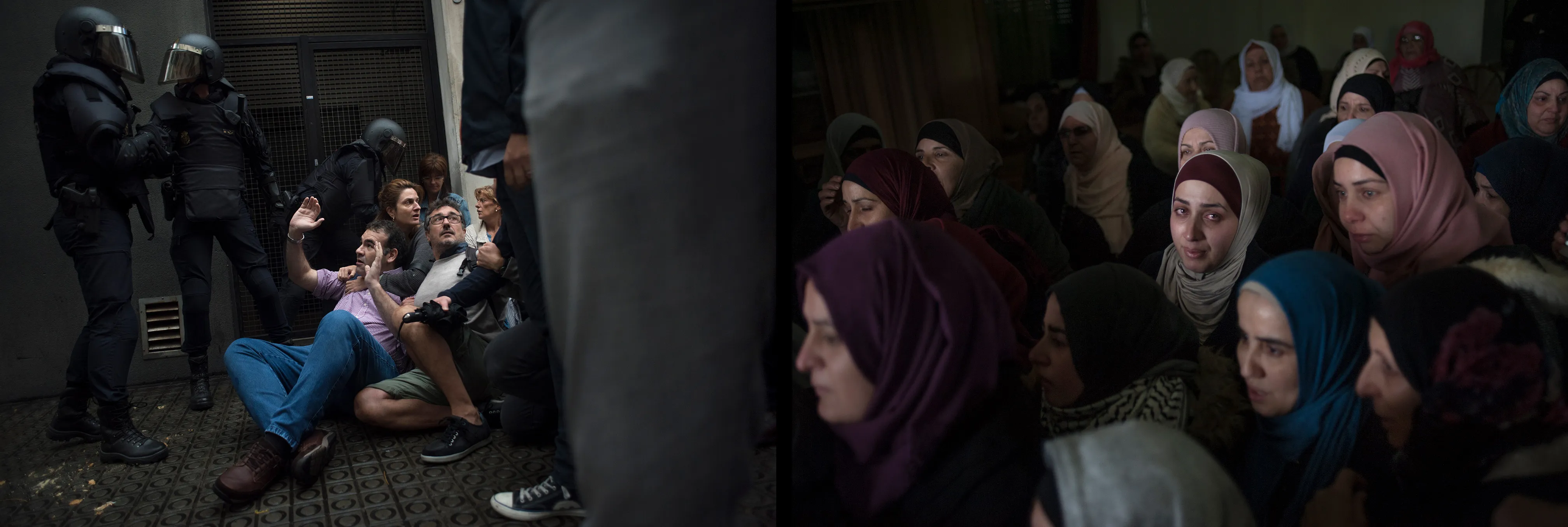 左: 10月1日,巴塞罗那,骚乱警察在一所作为加泰罗尼亚 独立公投 投票站的学校外面对公众。右: Reham Jouhar Aljaml 在2月21日的葬礼队伍中,告别她的姐夫的遗体,走出她位于西岸的家。