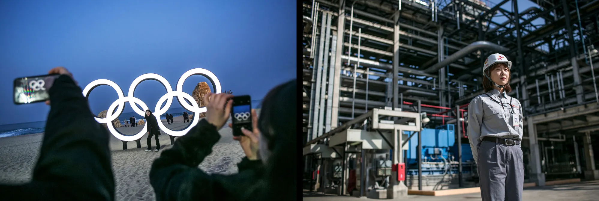 *左:*一名女性在平昌冬奥会前于奥林匹克环前摆姿势,时间是2月8日(为彭博社拍摄)。 *右:*下一代运营和信息系统工作组助理经理柳博英于2017年11月在韩国蔚山SK能源公司的炼油厂内摆姿势(为彭博社拍摄)。