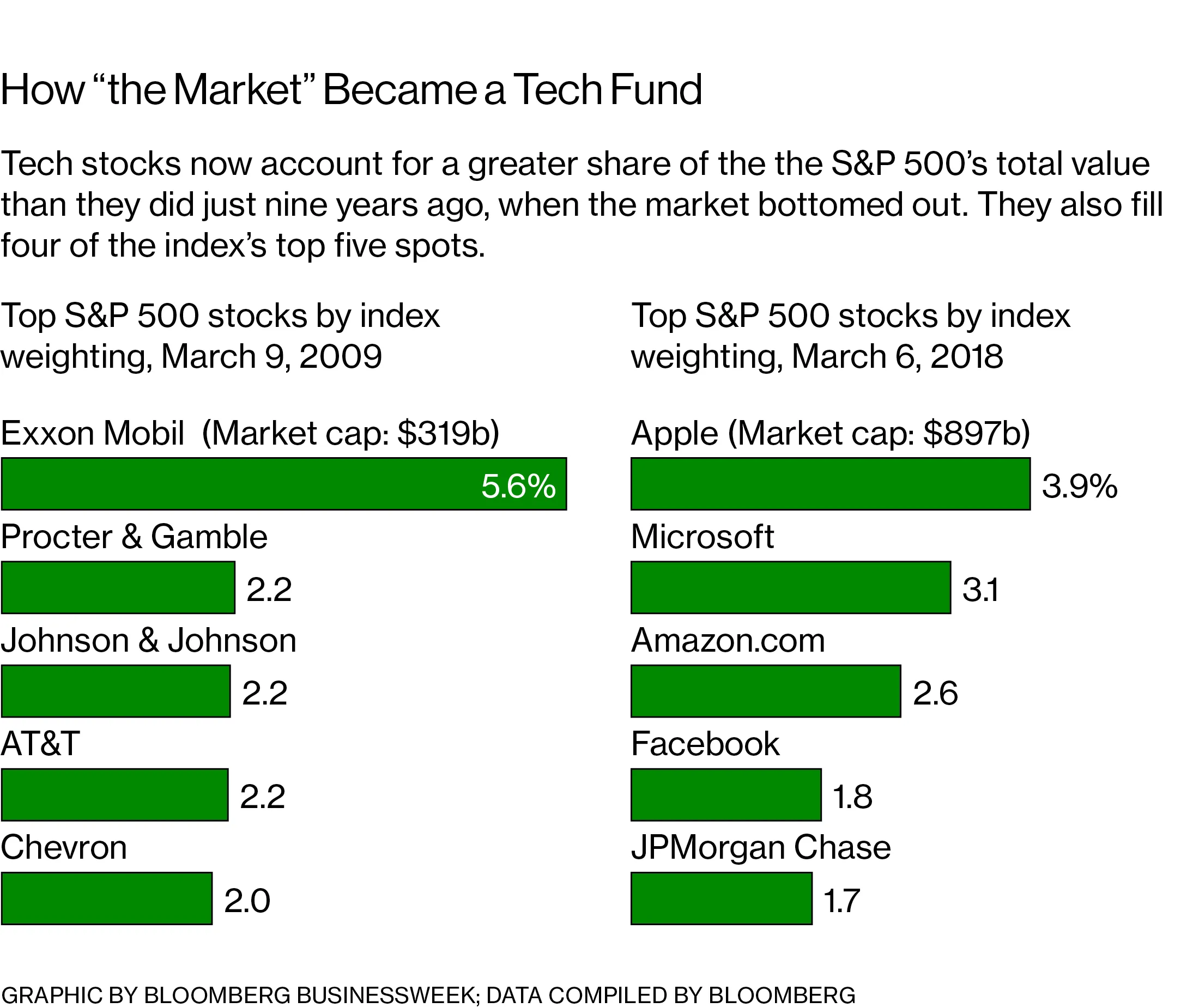 在2009年3月9日,S&P 500指数触底677点后九年,该指数现已达到2728点。与此同时,苹果公司的股票从11.87美元飙升至176.67美元。那么问题出在哪里?“当出现反转时,另一边会有动能,指数基金的最大部分将比市场下跌得更远,”财富顾问Sullivan Bruyette Speros & Blayney的首席投资官Jeff Porter说。