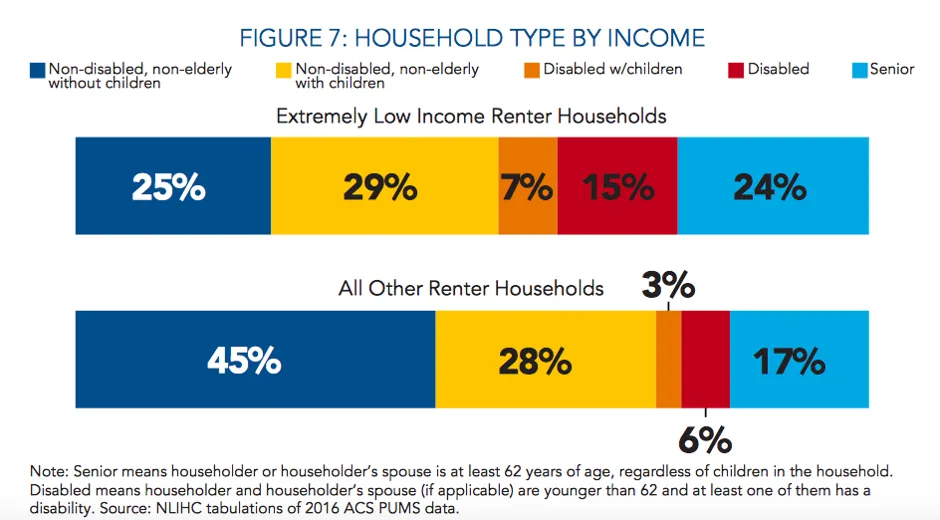 脆弱群体,如老年人、残疾人和有孩子的家庭,在极低收入租户中占比过高。报告指出,所有极低收入家庭中只有四分之一是“非残疾非老年人且没有孩子”。由于收入差距往往沿着种族界限划分,非裔美国人和西班牙裔居民也占据了极低收入人口的很大一部分:35%的极低收入租户是黑人,29%是西班牙裔。