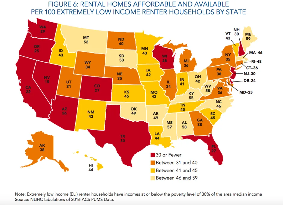 每个州每100个极低收入家庭可用的经济适用房单位少于59个。NLIHC对于超过四分之一的美国租户来说,寻找经济适用房变得越来越困难,他们的收入极低。六年来,国家低收入住房联盟每年发布一份报告,计算可用经济适用房单位与收入低于贫困线或地区中位数30%的租户之间的差距。去年,他们发现每100个被归类为极低收入(ELI)的家庭,仅有35个经济适用租赁住房可用——缺口超过700万个经济适用且可用的住房。这个数字今天依然存在。