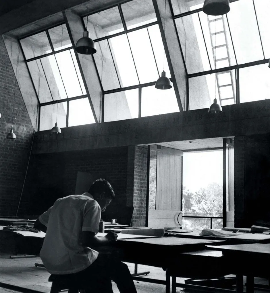 印度学研究所,艾哈迈达巴德,1962年。在这个项目中,建筑师必须考虑适当的照明、温度和湿度水平,以保护存放在内部的古代文物。阿希什·马尔霍特拉
