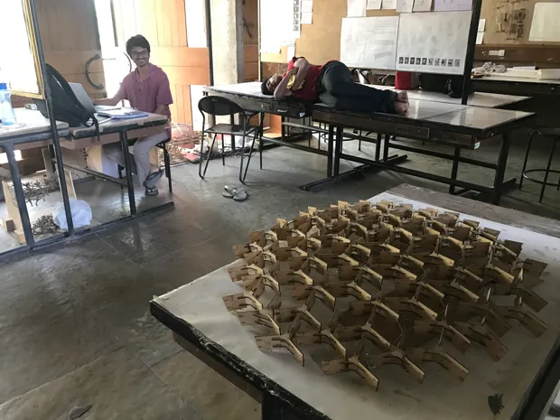 学生们在CEPT大学的多希建筑学院工作和休息阿希什·马尔霍特拉所以我一直在写,在[CEPT]校园里,我的整个想法是教育校园应该没有门。没有边界。这个哲学我一直在延续。