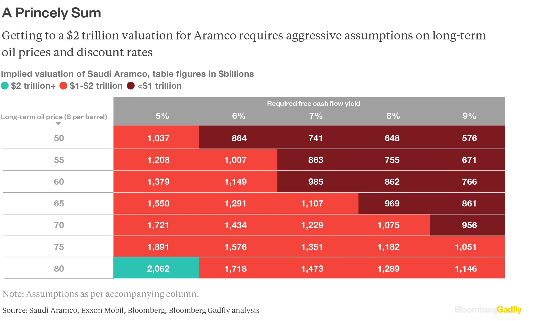 上周,我尝试对阿美石油进行一个粗略的估值。主要结论是,王储反复提到的2万亿美元的数字看起来完全不切实际,因为外国投资者主要希望获得自由现金流——并将其以反映阿美石油特殊风险的收益率进行定价: