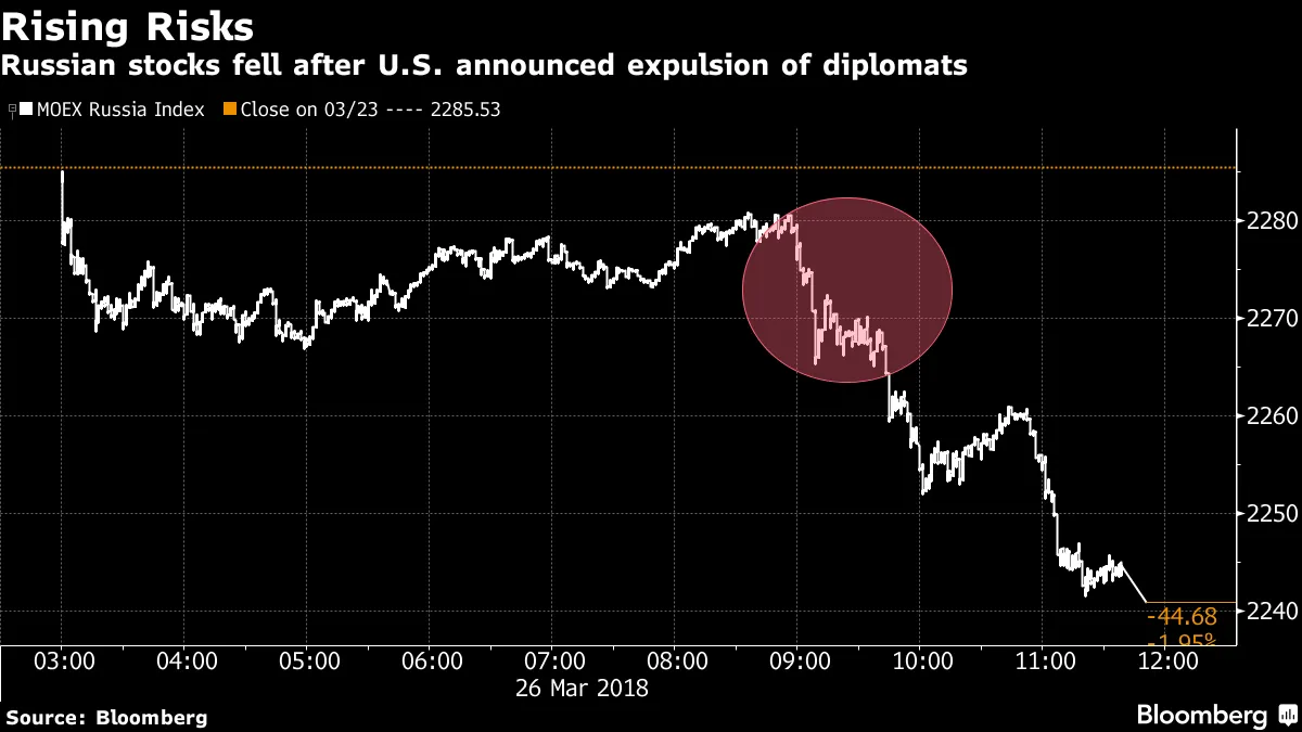 俄罗斯动荡无论你对驱逐60名俄罗斯外交官是否有效以促使克里姆林宫改变其行为有什么看法,至少金融市场认为这一举动可能会产生影响。MOEX俄罗斯股票指数下跌2%,是近一年来最大跌幅,而国家债券下跌,卢布在美国和十多个欧洲国家宣布一系列外交驱逐后抹去了涨幅,原因是英国一名前间谍中毒事件,彭博新闻的Ksenia Galouchko报道。“这些协调的驱逐行动严重打击了市场情绪,”伦敦投资银行Investec的新兴市场交易员Julian Rimmer告诉彭博新闻。“而情绪不仅让交易员对持仓感到不安,更倾向于抛售,同时也对未来投资形成威慑。”十年期卢布债券下跌,收益率上升五个基点至7.06%,而俄罗斯信用违约掉期攀升至1月1日以来的最高水平。“在俄罗斯对这一举动作出反应之前,以及整体形势变得更加明朗之前,我们建议做卢布卖出,”芬兰赫尔辛基Danske Bank的高级经济学家Vladimir Miklashevsky说。