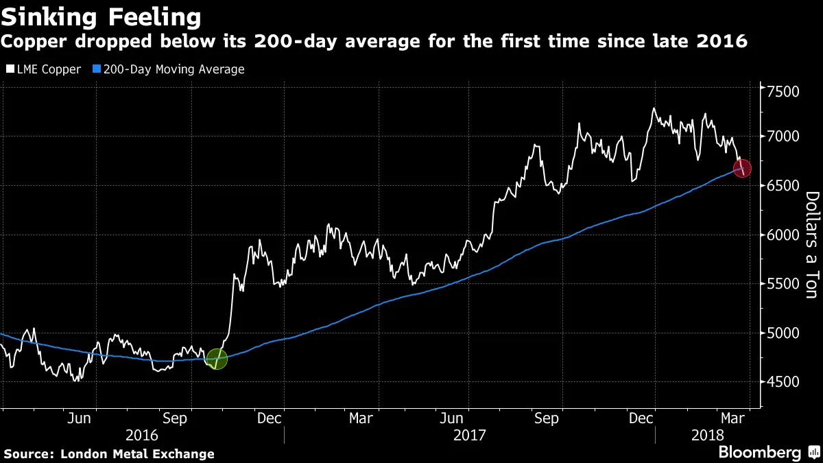 特朗普所赐,特朗普所夺还记得所谓的特朗普交易吗?那是一种购买预计会受益于特朗普政府的促进增长、支持商业政策的资产的策略。在2016年11月的总统选举和2月中旬之间,铜的价格上涨了约37%,几乎没有其他资产受益更多。但关于关税和贸易战的所有讨论使投资者纷纷撤退,在过去五周内价格下跌了约8%。Commerzbank的分析师丹尼尔·布里斯曼告诉彭博新闻:“当特朗普当选时,大家都认为他的政策会让商业生活更轻松。现在,我们在谈论可能的贸易战及其对全球经济的负面影响。”根据彭博新闻的马克·伯顿的报道,周一价格下跌了最多1.9%,因为中国官员和国家媒体在周末表示,白宫对其出口征收关税的计划可能会对美国造成反效果,并影响包括苹果、波音和英特尔在内的美国大型企业的销售。LME铜库存也达到了10个月以来的最高水平,现货合约的交易价格大幅低于期货,表明供应充足。