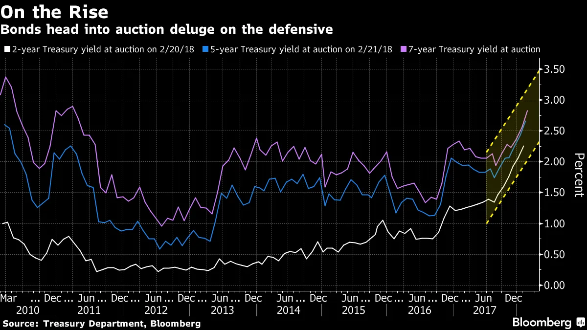 或者再说一次,也许投资者开始了解特朗普的谈判风格。瑞士信贷证券华盛顿研究负责人玛吉·盖奇在彭博电视台的采访中表示:“特朗普政府倾向于随着时间的推移,谈判到一个更合理的位置,或者更接近中心。”债券洪流开始这是美国债券市场的重要一周,财政部准备拍卖约$3000亿的票据和债券,这是有史以来最多的。如果第一天销售的结果可以作为任何迹象,华尔街的主要交易商——他们有义务在拍卖中出价——将不得不在未来处理大量的债务。政府周一出售了300亿美元的两年期固定利率债券,这是自2014年中以来该到期债券的最大发行量。经过一番折腾,主要交易商持有了41.3%的证券,这是自12月以来的最大份额。由于美联储并未放弃今年三次加息的计划,少数投资者愿意持有短期债务。两年期收益率为2.30%,仅比美联储的联邦基金利率目标高出约半个百分点。除了两年期债券外,美国还出售了510亿美元的三个月期票据和450亿美元的六个月期票据。周二,政府将提供650亿美元的四周期票据、240亿美元的一年期票据和350亿美元的五年期债券。