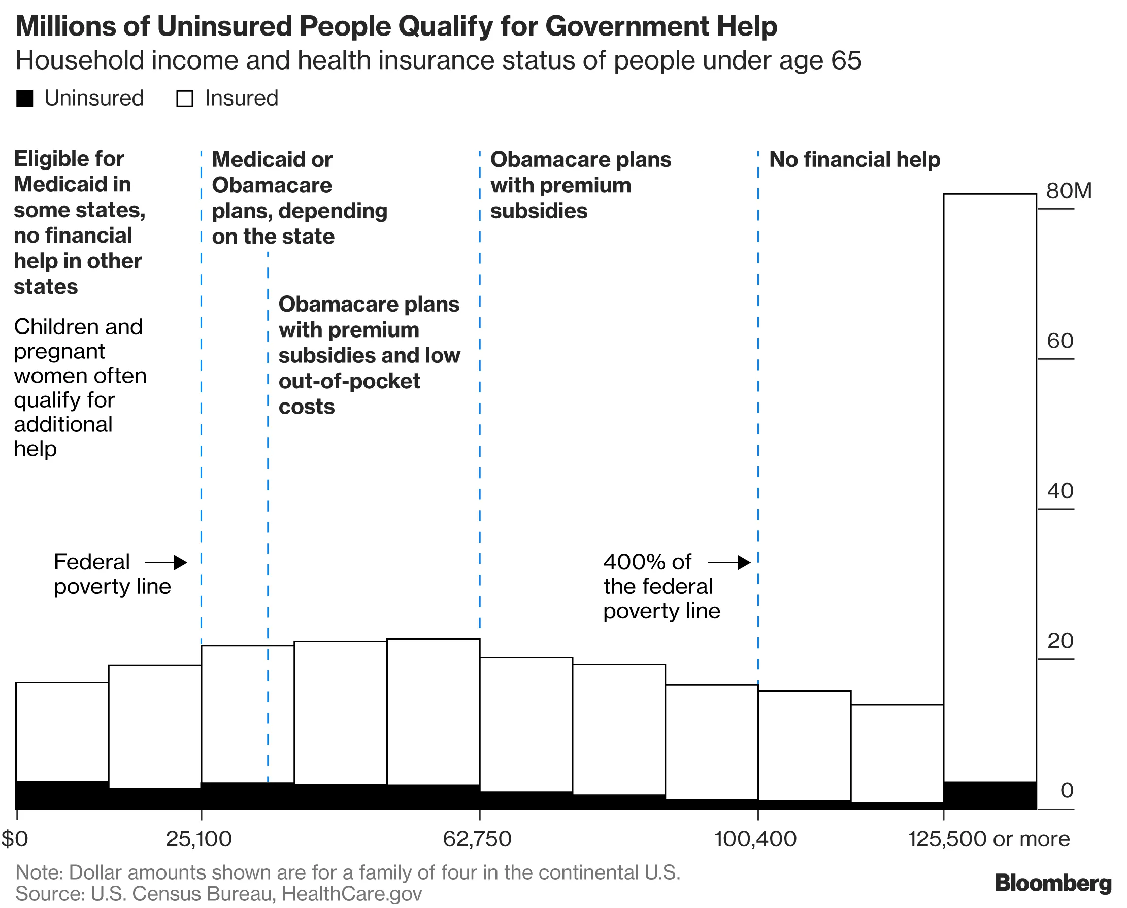 接近贫困线的人可以免费获得医疗补助,而收入更高的人——对于一个四口之家来说,收入可达约10万美元——则获得补贴以降低私人健康计划的价格。