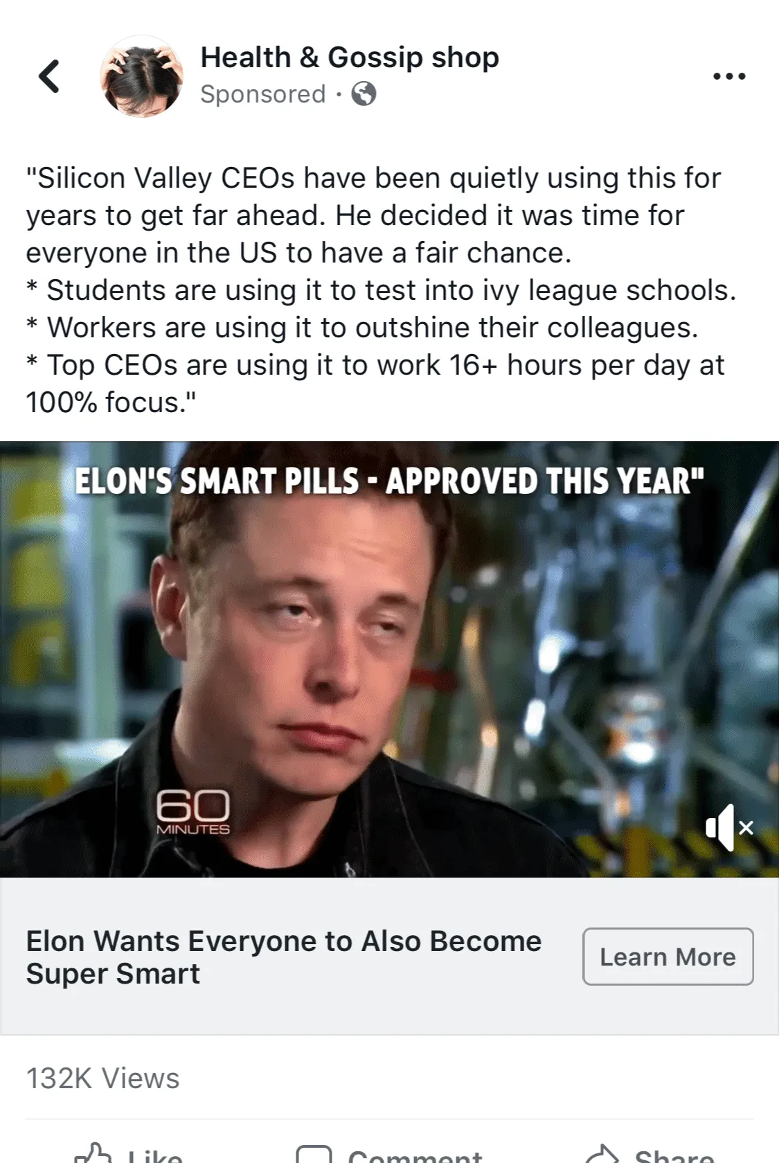 最近的一则Facebook广告错误地暗示特斯拉公司联合创始人在60分钟节目中谈论过这些“智能药丸”。“我们深切致力于打击恶意广告商和保护人们的数据,”Facebook的商业和市场合作副总裁David Fischer在一份声明中表示。“我们要求所有员工遵循我们的行为准则,并在Facebook上为人们和广告商的最佳利益行事。”在2017年2月,该公司聘请了Leathern,一位43岁的南非广告初创公司创始人,他因撰写一系列关于他所描述的“次级广告”的在线帖子而引起关注。他在Facebook的工作在持续的批评中进行,这些批评认为社交网络正在帮助创造一个几乎无法信任的社会——这种情绪在披露与特朗普有关的咨询公司剑桥分析公司在未获用户许可的情况下获取了5000万用户的数据后达到了新的强度。