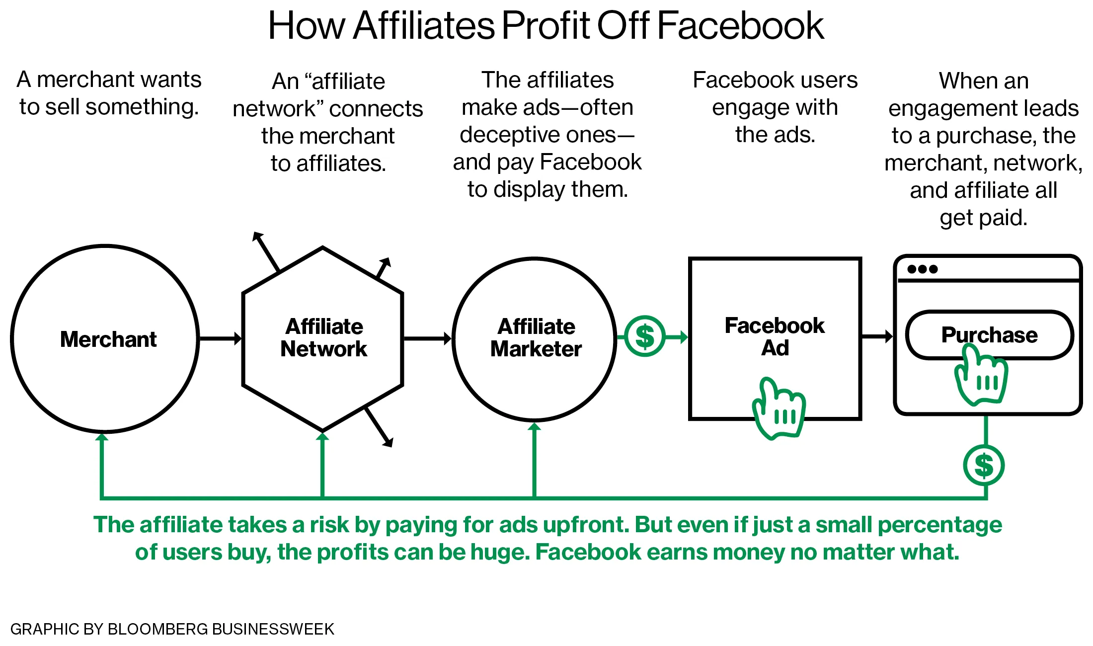 基本过程并不复杂。例如:一个假冒减肥药的制造商想以每月100美元的价格出售这些药物,并不在乎如何做到。药丸供应商接触一个被称为合作伙伴网络的经纪人,并提供每个注册支付60美元的佣金。网络向合作伙伴传播消息,合作伙伴设计广告并支付费用在Facebook和其他地方投放广告,希望能赚取佣金。合作伙伴承担风险,支付广告费用而不知道它们是否有效,但如果即使只有一小部分看到广告的人变成买家,利润也可能是巨大的。