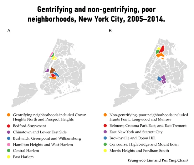 这项研究的主要作者,来自纽约市卫生与心理卫生局的Sungwoo Lim和Pui Ying Chan,直觉认为被迫离开家园的人会遭受某种健康后果。在一年半的时间里,他们查阅了医院记录,并分析了28个城市社区中12,882名居民的全国人口普查调查,追踪居民的迁移,通过审查国家人口普查数据中记录的地址变化,持续了九年。