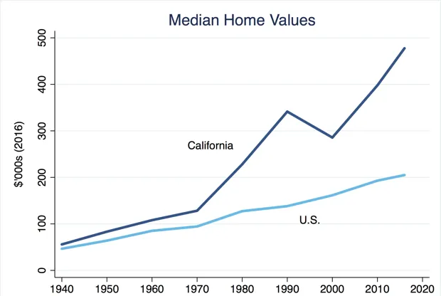 为什么加利福尼亚的房价如此之高?情况并非一直如此:在1940年,该州的房屋价值仅比全国其他地区略贵,但从1970年左右开始,它们开始显著分化。由于气候、自然美景和繁荣的经济,加利福尼亚始终对人们具有强大的吸引力。然而,只要新建的住房能够满足被吸引到加利福尼亚的人们,房价增长就会受到限制,该州的魅力也会转化为人口增长:从1940年到1970年,加利福尼亚的人口增长速度比全国快242%,而其中位房价的增长速度仅比全国快16%。