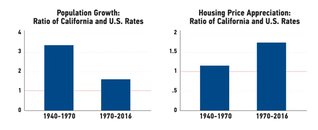 由于其城市在扩展领土方面受到阻碍,并且在很大程度上被阻止密集发展,加利福尼亚州的新住房建设减少:该州的吸引力不再产生与以前相同的人口增长。相反,受抑制的住房供应将该州的吸引力转化为房价增长,因为购房者被迫竞争更少的住房。房价上涨迫使居民以比以前更高的速度离开该州,并越来越多地阻止潜在的新居民搬入(尤其是国内的)。而加利福尼亚州的人口增长在1940年至1970年间比全国速度快242%,但在1970年至2016年间,仅比全国速度快68%。相比之下,过去30年中中位房价仅比全国快16%的增长,现在则比全国快78%。