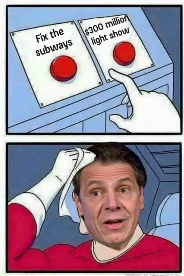 州长,您想要什么?由Miles Blount提供如果您仍然迷失在修辞300级的讽刺中,可以看看另一个实际的表情包,由NUMTOT成员Miles Blount创作。一个漫画书超级英雄,脸是安德鲁·库莫州长,正在为按哪个红色按钮而汗流浃背——“修复地铁”还是“3亿美元的灯光秀”。很多纽约人会明白这个笑话,因为他们知道库莫在现实生活中选择了哪个。Orenstein说,表情包有一种让干燥政策更易于普通人理解的方式:“关于MTA糟糕的事情——每个人都能对此产生共鸣。”