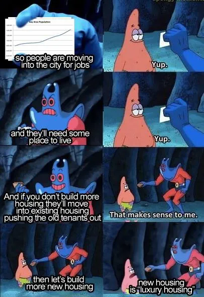 在其他地方,马克思主义者、市场城市主义者和YIMBY们正在讨论SB 827可能产生的各个方面,既文明又不文明。一位成员,Caleb Coggeshall,发布了一张关于奢侈住房的挑衅 海绵宝宝的表情包,与奢侈住房相关的话题获得了1000个赞和78条评论,大多数是愤怒的。“建造符合最高收入要求的经济适用房,你这个富有的傻逼,”一位持不同政见的左翼TOT说道。