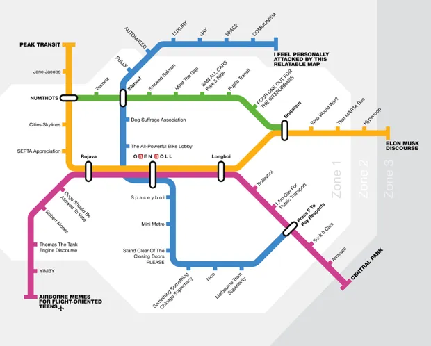 一张交通风格的“地图”细节,指引NUMTOT成员到达他们讨论的自然终点。由米切尔·谢尔德里克提供实际上,不是的:Facebook上城市规划讽刺的最大源头的原名是“新城市主义垃圾帖子”。它的当前名称——被知情者缩写为NUMTOT——不久后出现,因为一小部分成员开始对道路拓宽项目进行讽刺,并通过迷因比较交通系统。“这并不是想要变得严肃,”现在在波士顿一家交通咨询公司工作的埃尔德雷德本月早些时候说。