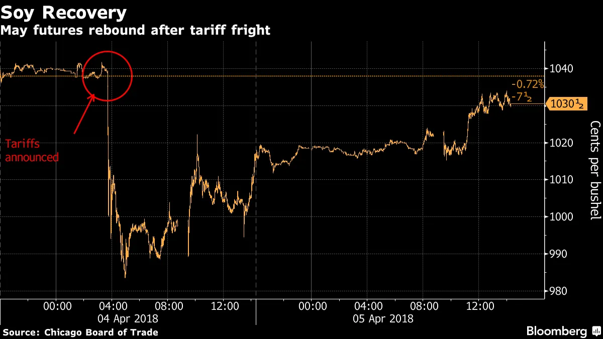 这里还有更多证据表明反弹可能处于不稳固的基础上:彭博社新闻的宏观策略师卡梅伦·克里斯在周四早些时候报道,过去一年表现最差的30只标准普尔500股票平均上涨了1.17个百分点,超过了整个指数。“在贸易紧张局势初次出现以及美国和中国之间的反复交锋和对北美自由贸易协定的担忧之后,我认为市场现在开始看透谈判的虚张声势,并且他们正在减少对全面贸易战的重大恐惧,”华盛顿交叉顾问公司的高级投资组合经理凯文·卡伦告诉彭博社新闻。**‘冷静的头脑’**根据彭博社新闻的施鲁提·达特·辛格报道,农业商品价格在周四反弹,抹去了前一天因市场受到中国计划对美国大豆、玉米和棉花征收关税的影响而出现的严重损失。在纽约ICE期货交易所,5月份交割的棉花抹去了周三的损失,并有望实现一个月以来的最大涨幅。5月份大豆期货在昨天一度下跌5.3%后几乎全部回升。玉米和小麦也上涨。初步消息引发了一种“膝跳反应”,芝加哥标准谷物公司的总裁乔·瓦克拉维克告诉彭博社新闻。随后,白宫官员缓和了对贸易的立场,表示这些关税可能永远不会实施。“冷静的头脑占了上风,”INTL FCStone的首席商品经济学家阿兰·苏德曼在电话采访中说。市场现在重新关注其他消息,例如农业部报告的“强劲”的美国大豆出口销售,以及美国平原地区的干旱和寒冷天气可能会阻碍小麦的生长,苏德曼说。早期价格的下跌也为农业商品的使用者提供了买入机会,他补充道。