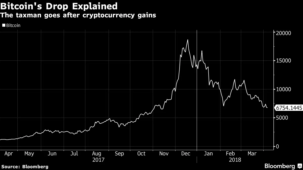比特币忧郁甚至连加密货币,长期以来一直是犯罪分子和希望保持隐秘的其他人偏爱的交易手段,也无法逃脱税务部门的追踪。今年,加密货币面临着巨大的压力,比特币本周跌破 7000 美元,损失了大约一半的价值。虽然对这种疲软有各种解释,但Fundstrat Global Advisors的研究主管汤姆·李认为,部分下跌与 4 月 15 日的所得税申报截止日期有关。这是因为那些在数字代币上大赚特赚的投资者一直在出售部分持有以支付 250 亿美元的资本利得税,彭博新闻的乔安娜·奥辛格引用李的研究报告称。“这是从加密货币到美元的大规模流出,”李写道。“历史估计每 1 美元的美元流出对加密市场价值的影响为 20-25 美元,”李写道。这个 250 亿美元的预测源于他对美国家庭在 2017 年从加密货币中获得 920 亿美元应税收益的估计。李估计,2017 纳税年度的资本利得收入将创下 1680 亿美元的记录,他对比特币的年末价格目标为 25000 美元。