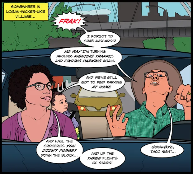 一个漫画面板显示芝加哥爸爸在回家的路上被堵在交通中。他意识到自己忘记买鳄梨了。真糟糕! 这下塔可晚餐泡汤了。但当霍姆伍德爸爸想起鳄梨时,他可以跳上车,几分钟内就能回到商店。塔可晚餐得救了。