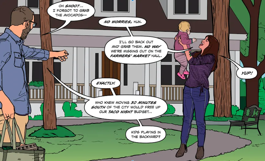这证明了一个20年前无法想象的事实:郊区现在必须努力吸引他们为之建造的群体。这些广告唤起了一种奢华的乐园,细节如同一集 波特兰 的讽刺剧:鳄梨、康普茶、农场到餐桌的早午餐、街头集市。在那集有纹身妈妈的广告中,她身边有一个男士(她的伴侣?)正在看他的iPhone,穿着一件写着“本地食品”的T恤。但有个转折:在这里,生活在这种进步城市陈词滥调中的人们是郊区居民。