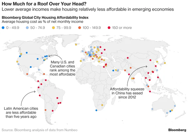 彭博新闻根据这一指标,世界上最难负担的城市都位于全球南方——如河内、孟买、波哥大、布宜诺斯艾利斯和里约热内卢等城市,住房成本超过收入的200%或300%。最难负担的城市是加拉加斯,其经济正在急剧下滑。在那里,平均住房成本超过收入的3000%以上。
