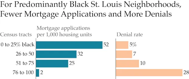 以黑人为主的普查区的家庭申请的抵押贷款总体上较少。这是恶性循环的一个方面: 种族财富差距使许多黑人美国人无法申请抵押贷款。杰克逊维尔黑人家庭的中位收入为34,692美元,而白人家庭的中位收入为56,771美元。
