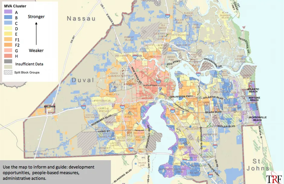 在2015年10月,再投资基金,一家社区发展金融机构,对杰克逊维尔的住房市场及其市场强度进行了分析,市场强度由销售价格和邻里入住率、止赎、空置和房屋改善定义。结果地图看起来与80多年前的红线地图惊人相似。