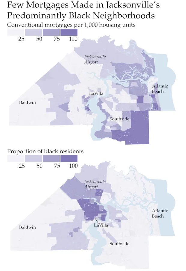 银行批准或拒绝抵押贷款的地图揭示了一个明显而戏剧性的差异模式:在 法定 隔离曾经是常态的地方, 事实上的 隔离仍然存在。例如,在杰克逊维尔,新房抵押贷款仍然落在银行为了防止黑人家庭搬入白人社区或积累财富而划定的同一条界线内,这一情况已有约80年。