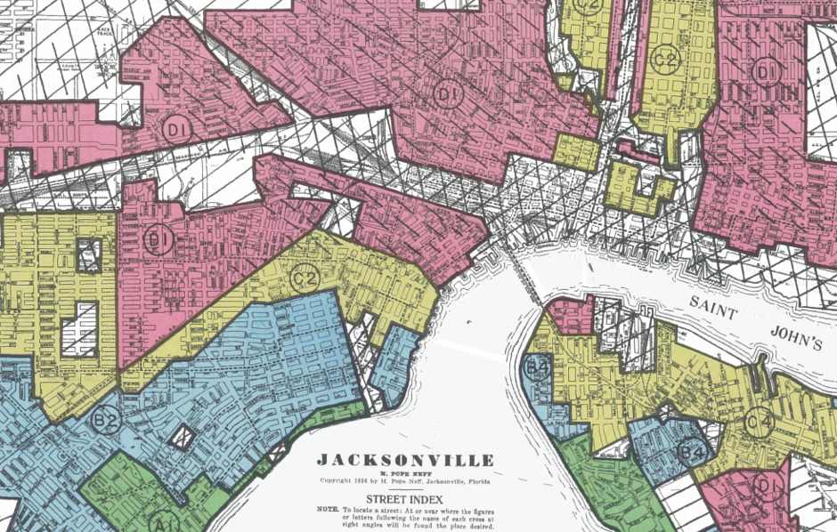 杰克逊维尔作为一个历史上黑人比例较大的城市(到1910年,城市中有50%的黑人),早期就采用了种族分区。但红线的持续存在超出了产生吉姆·克劳立法的南方城市。今天,北方和中西部城市之间的黑人和白人家庭在抵押贷款批准方面也存在巨大差距。在2015年和2016年,圣路易斯市仅有5%的黑人居民获得了常规抵押贷款——尽管他们占总人口的48%。