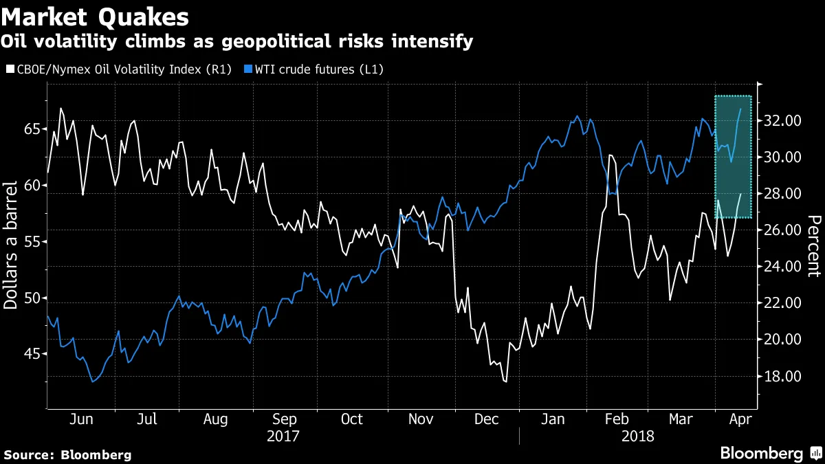 通货膨胀还是衰退?关于能源成本上升是否增加价格压力或对经济造成拖累的古老辩论,随着油价飙升和汽油价格升至2015年以来的最高点,可能会再次升温——忽略8月底哈维和厄玛飓风后的短暂激增。无论你倾向于哪一方,知道交易者对石油的看涨情绪自2014年以来未曾如此强烈,当时石油价格为每桶105美元,比当前每桶67美元的价格高出超过50%。这可以从西德克萨斯中质原油的所谓看涨偏差中看出,该偏差衡量投资者愿意为看涨期权支付的价格与看跌期权的差价,正如彭博新闻的戴维·马里诺所述。目前,地缘政治是能源市场的主要驱动因素,而非全球经济的增强。周三,纽约的油价期货上涨了2%,因为世界最大的石油出口国沙特阿拉伯在特朗普总统警告美国导弹可能很快打击叙利亚后几个小时拦截了一次针对其首都的导弹攻击。