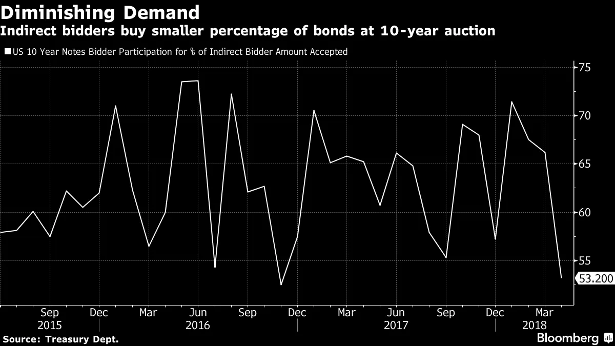 尽管美国政府报告显示国内石油库存增加,能源市场仍然上涨,彭博新闻的杰西卡·萨默斯表示。“地缘政治风险将市场推高至三年来的最高点。这是很长时间以来,原油市场和股市方向首次出现分歧,”佛罗里达州威灵顿的能源分析集团有限公司总监托马斯·芬伦表示。“这种相关性在地缘政治风险加剧时停止。” 在债券拍卖中有真相连续第二天,美国政府的债券拍卖未能引起投资者的任何兴奋。包括外国中央银行在内的一类投标者仅购买了210亿美元10年期国债中微不足道的53.2%,为2016年11月以来的最低水平。需求下降的背景是,越来越多的猜测认为外国投资者可能通过将资金分配到美国金融资产的比例降低,来抵制美国的政策和财政宽松。如果属实,这种回撤可能迫使政府在拍卖中提供更高的收益率以产生足够的需求,从而使融资不断膨胀的预算赤字变得更加昂贵。当然,一次拍卖并不能代表趋势,但这次拍卖是在交易商被困于财政部拍卖的300亿美元三年期国债中40.9%的情况下进行的,这是自9月以来的最高比例。根据彭博社汇编的数据,投资者平均每1美元的政府债务出价约2.75美元,为2009年以来的最低水平。