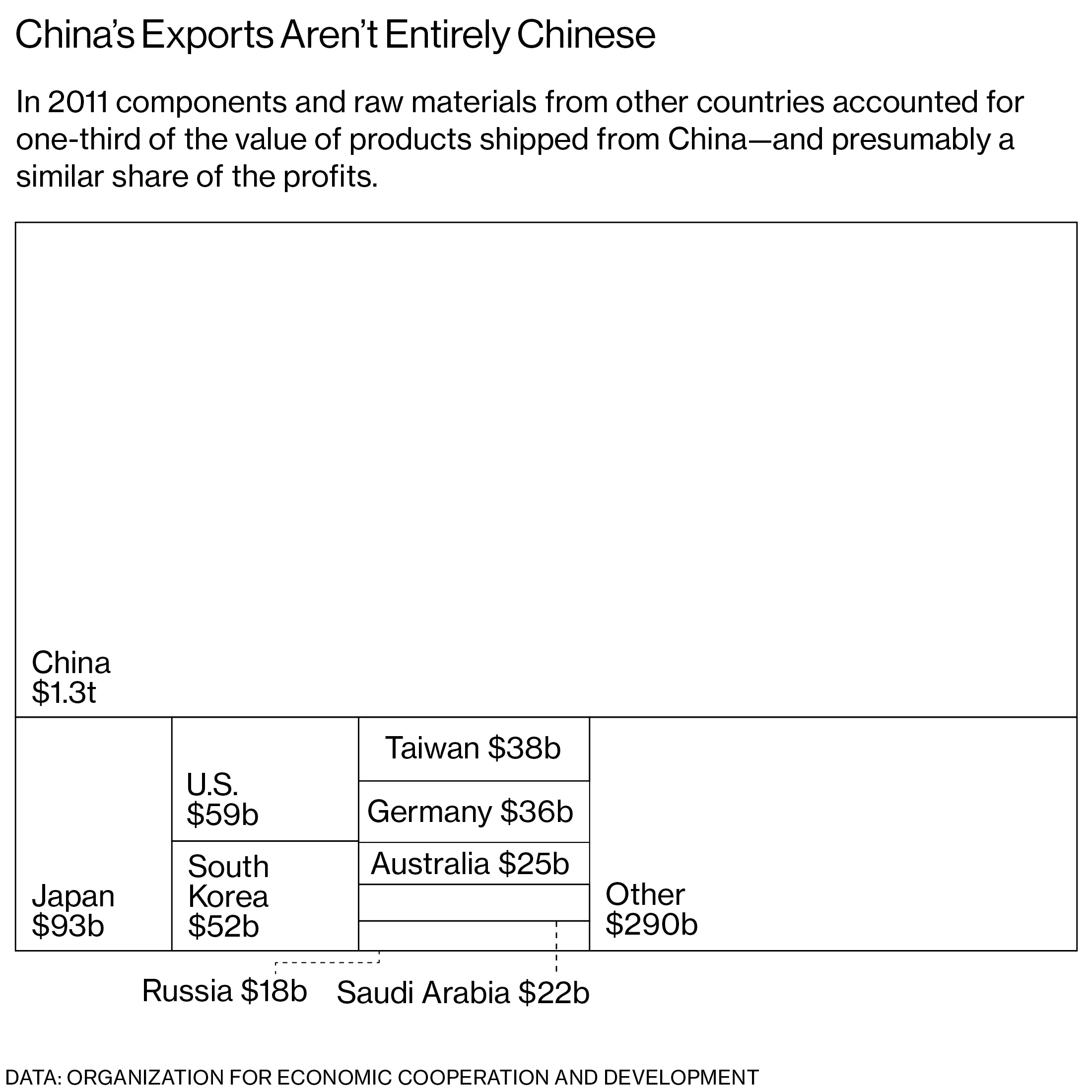 不太为人所知的是,关税是笨拙的工具,会影响供应链中的每个国家,而不仅仅是那些被针对的国家。现在几乎没有什么有趣的产品可以简单地标记为“美国制造”或“中国制造”。根据经济合作与发展组织的数据,截至2011年,中国的总出口中只有三分之二的价值是在中国增加的。日本、美国和韩国提供了大部分的价值,因此赚取了大部分的利润(图表)。iPhone就是一个极端的例子。根据雪城大学的杰森·德德里克和加州大学欧文分校的肯尼斯·克雷默对iPhone 7的计算,iPhone零售价格中只有大约1%的成本来自中国劳动力。
