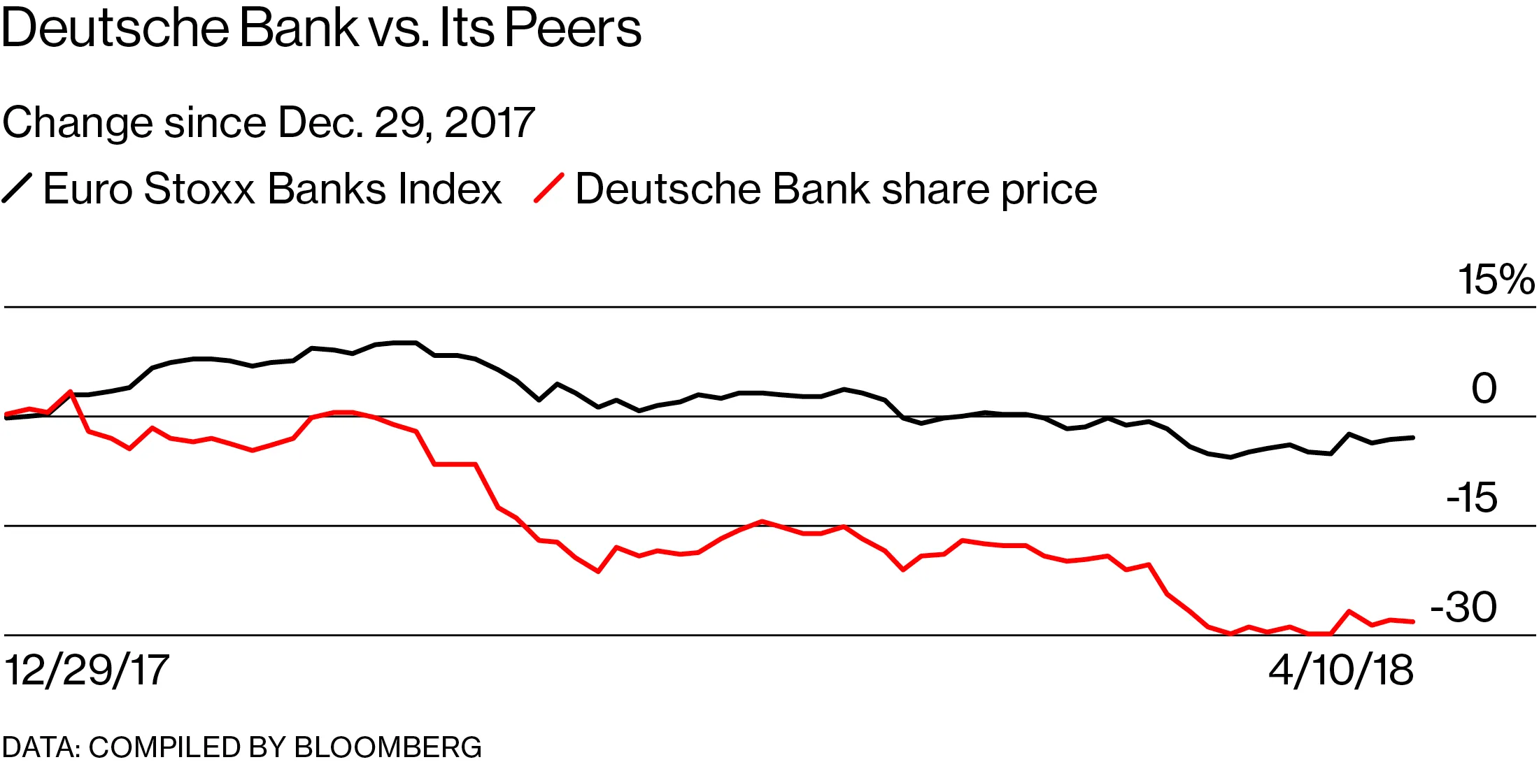 股东们已经等待多年,希望德意志银行能弄清楚它想成为哪种银行。它的欧洲竞争对手在后危机的阴霾中走出,准备迎接不断增长的经济带来的好处。法国的法国巴黎银行在二月份表示,由于其本土市场贷款量的增加,它可能会在2020年超越盈利目标。瑞士银行巨头瑞银集团和瑞士信贷集团已重新聚焦于财富管理。在意大利,顶级贷款机构联合信贷银行的股票在过去12个月中回报约25%。在同一时期,欧洲斯托克银行指数小幅上涨——而德意志银行的股票下跌约25%。