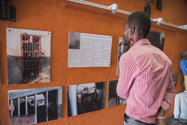 一位访客在二月份参观位于太子港的FOKAL艺术中心的展览。让·马克·赫尔维·阿贝拉尔该展览还包括塞伊·罗德斯的摄影作品,几个月前首次在法国文化中心展出。它得到了 海地人权局 (BDHH) 的支持,这是一个由提供法律援助给囚犯的律师组成的非营利组织。BDHH的代表表示,2010年7.0级地震摧毁了城市的大部分后,国家的主要监狱从未重建,但尽管一些墙壁和天花板只有一半,但它仍关押着超过4000名囚犯,约是700人容量的六倍。根据2016年联合国海地稳定特派团委托的监狱囚犯人口调查,绝大多数——80%——正在等待审判。