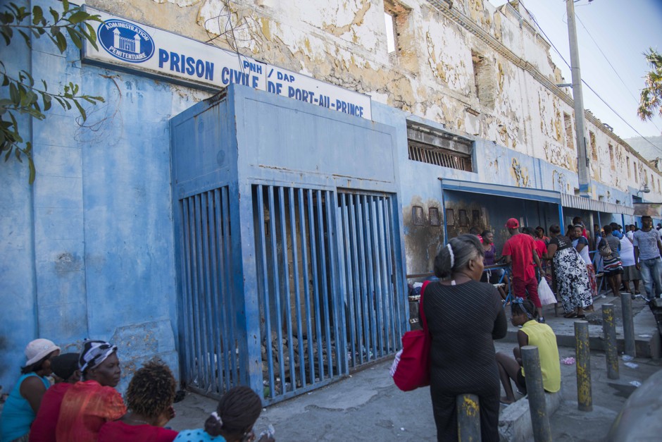 人们在太子港的监狱外等待探视囚犯。让·马克·赫尔维·阿贝拉尔这位艺术家因目睹海地国家监狱的窒息恐怖和绝望而感到困扰,他在自己的作品中找到了安慰。