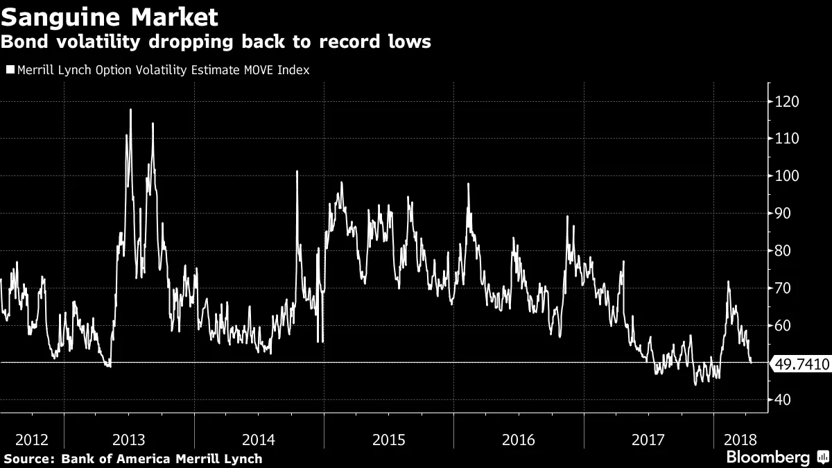 所谓的空头挤压的事情在于,它们允许空头在更具吸引力的水平上重新调整头寸。“与其说是‘美国的早晨’,不如说是‘美国的欢乐时光’,”摩根士丹利的策略师,包括迈克尔·泽扎斯、马修·霍恩巴赫和安德鲁·希茨在周二的研究报告中写道。市场“更接近一天的结束,而不是开始。”有序的熊市如果长期预测的债券熊市已经到来,交易员似乎并不太担心。这可以从美国银行美林的MOVE指数中看出。美国国债市场预期波动性的指标在周一首次跌破50,达到了三个月来的最低水平。现在它更接近于约44的历史低点,而不是今年早些时候约72的高点。该指标的下降可能表明,交易员越来越怀疑美联储会按照计划在今年再加息至少两次,尤其是经济可能放缓的迹象。亚特兰大联邦储备银行广受关注的GDPNow,旨在实时跟踪经济增长,显示经济可能以略低于2%的速度扩张。然后是收益率曲线的持续平坦化,这一趋势通常预示着增长放缓。两年期和10年期国债收益率之间的差距缩小至42.5个基点,为2007年以来的最小差距,低于今年二月份的78个基点的高点。投资者和策略师预测收益率曲线将出现倒挂,这在最近的历史上每次衰退前都曾发生。“我们看到的收益率曲线平坦化到目前为止是正常过程的一部分,随着美联储加息,长期利率有所上升——但收益率曲线变得更平坦是完全正常的,”约翰·威廉姆斯在周二马德里表示,他将在6月接任纽约联邦储备银行行长。