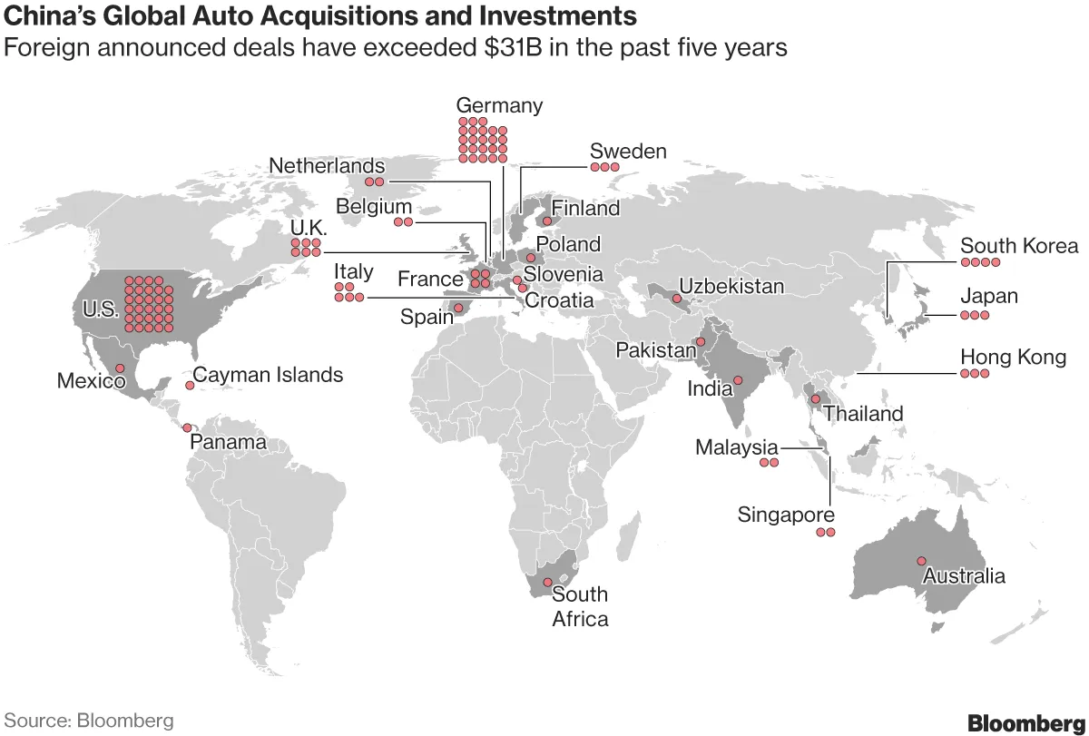 中国公司在过去五年中宣布了至少310亿美元的海外交易,购买了汽车制造商和零部件生产商的股份,数据由彭博社汇编。