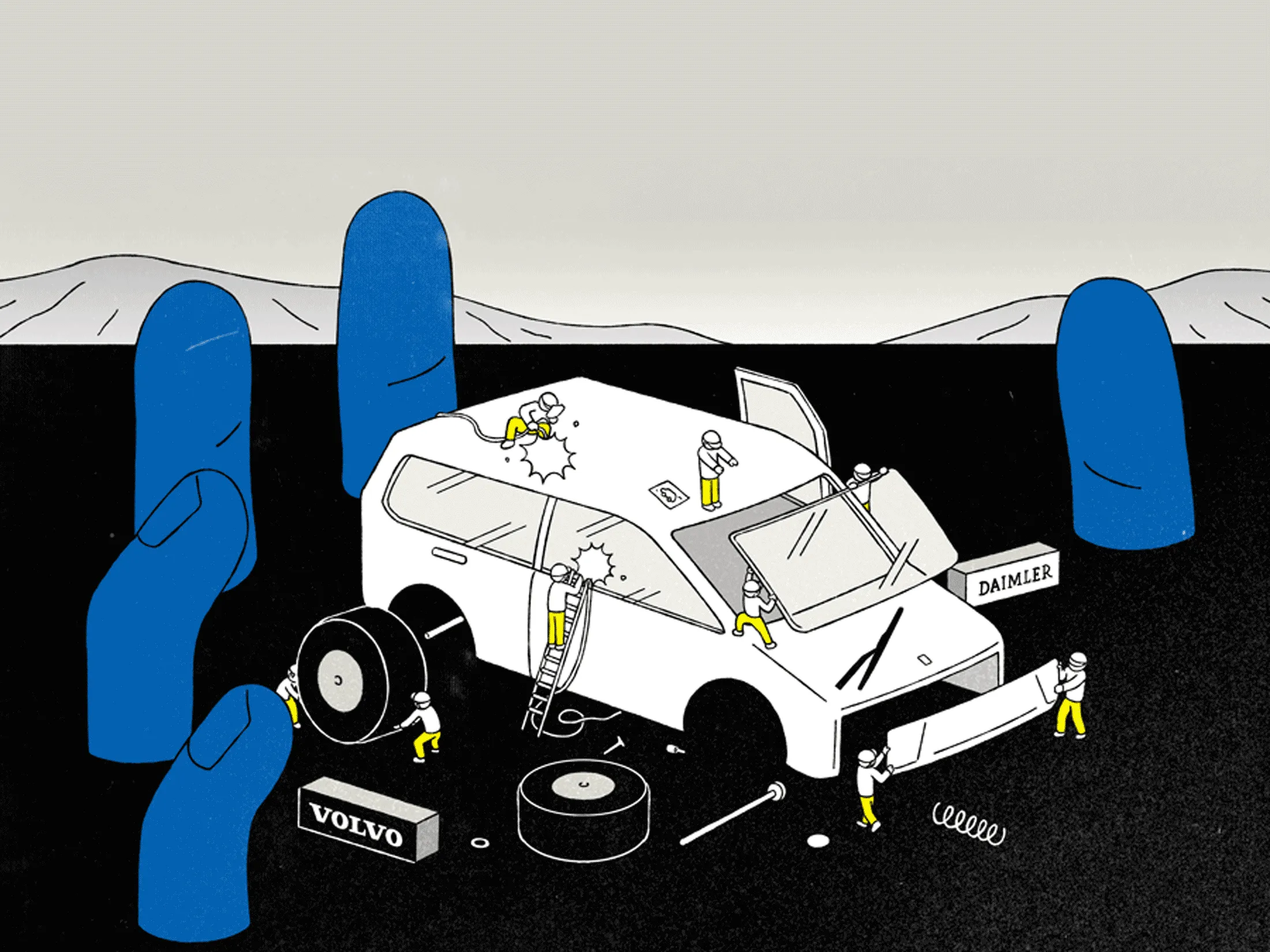 插图:Woshibai 为彭博商业周刊提供在阿姆斯特丹的一个明亮春日,汽车爱好者走进一个黑暗的仓库,品尝羊肉串,喝着由 Lynk & Co. 提供的大黄鸡尾酒。