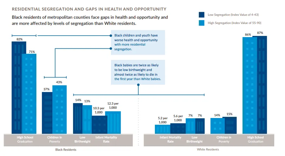 白人和黑人、西班牙裔、美国印第安人/阿拉斯加土著以及亚洲儿童之间的隔离模式在全国范围内延续了不良健康结果——例如低出生体重、婴儿死亡率、儿童贫困和低高中毕业率。这在各个种族和民族群体中都成立,并影响了报告中的几乎所有指标。
