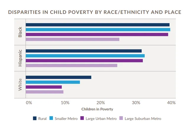 报告指出,生活在贫困中的儿童上好学校的机会较少,获得生活工资工作的机会也较少,且在生活后期健康状况较差。尽管从数字上看,生活在贫困中的白人儿童比其他任何种族的儿童都要多,但对黑人、西班牙裔和美洲印第安人/阿拉斯加原住民儿童的威胁最大:对于这些群体,儿童贫困的比例是白人儿童的两倍。事实上,对于黑人和西班牙裔儿童来说,郊区县的贫困率高于农村县的白人儿童。